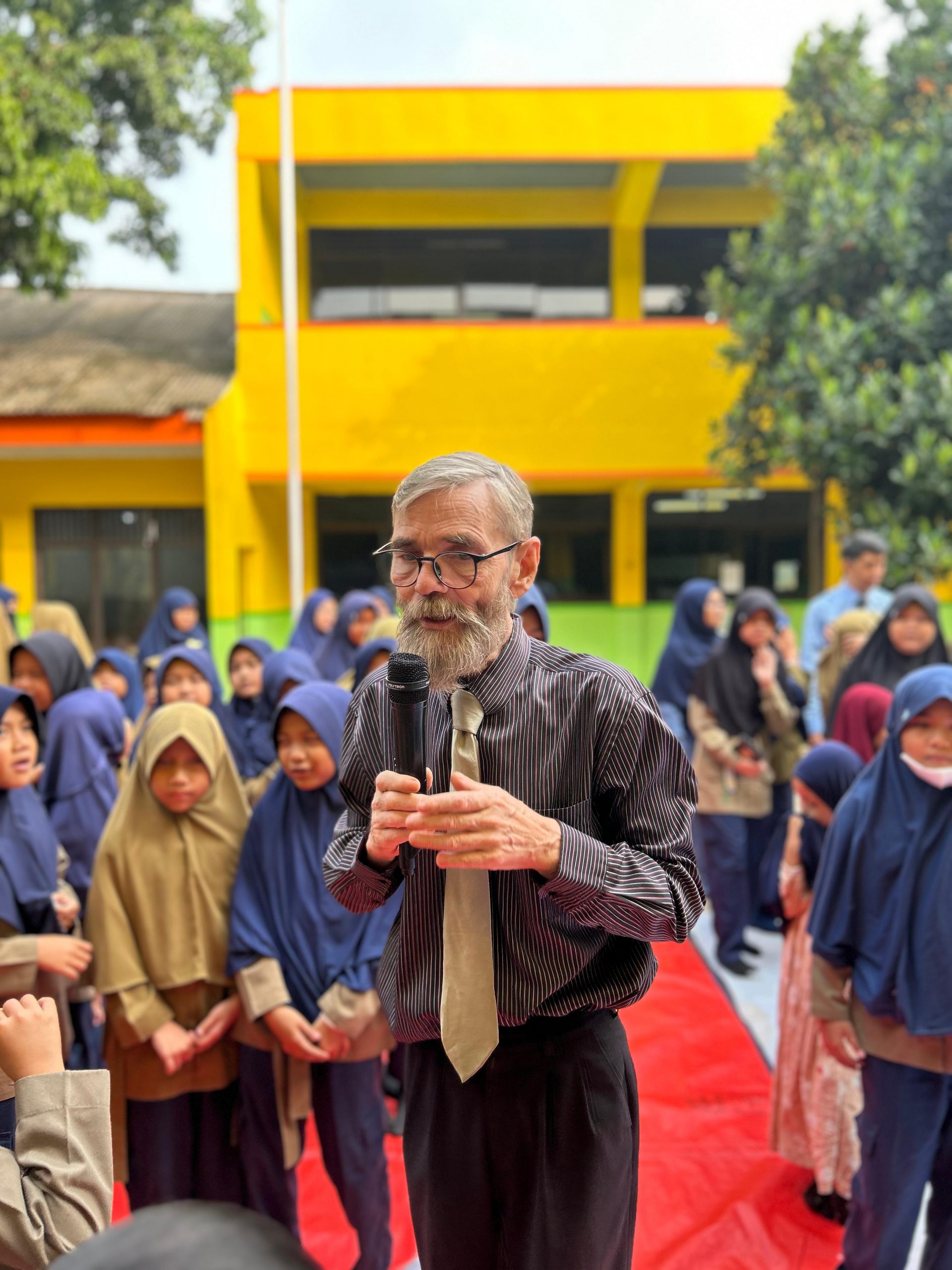 Kegiatan Native Speaker berlangsung di lapangan sekolah dengan peserta seluruh siswa kelas 1 sampai kelas 6. Tampak siswa kaget dan juga malu-malu saat Mr. Robert menyapa dan mendekati, karena siswa akan ditanya atau diminta berbicara dengan bahasa Inggris.
