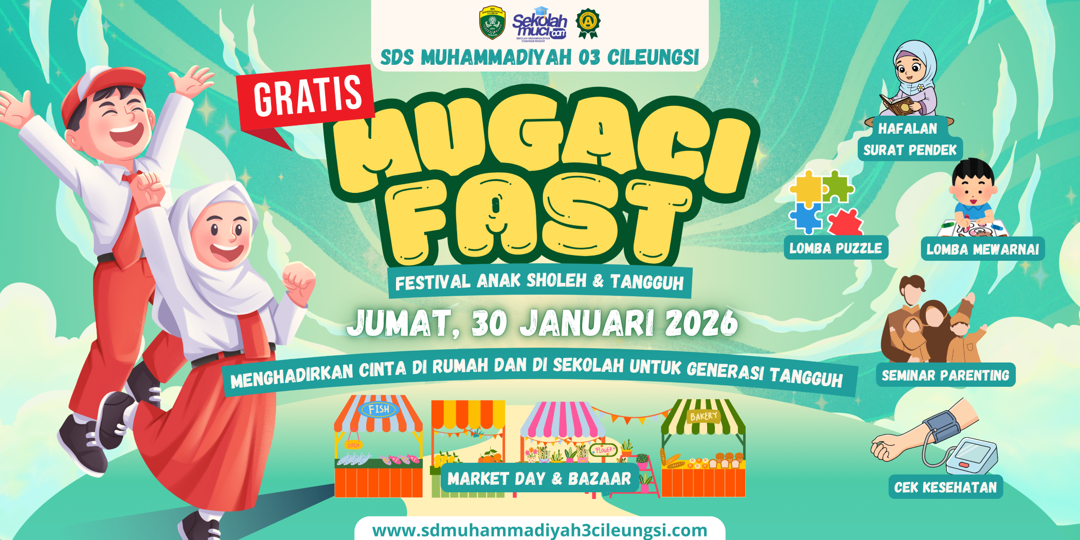 Dalam rangka mengembangkan potensi siswa SD Mugaci, menjalin silaturrahmi dengan TK yang berada di Kecamatan Cileungsi dan Kecamatan Klapanunggal, serta memberikan pencerahan tentang pola pengasuhan keluarga (parenting). SD Mugaci menggelar acara MUGACI FAST 2026. MUGACI FAST 2026 yaitu SD Muhammadiyah 3 Cileungsi Festival Anak Sholeh dan Tangguh yang dilaksanakan pada Jumat, 30 Januari 2026 dengan tema “Pendidikan anak di sekolah dan di rumah”.