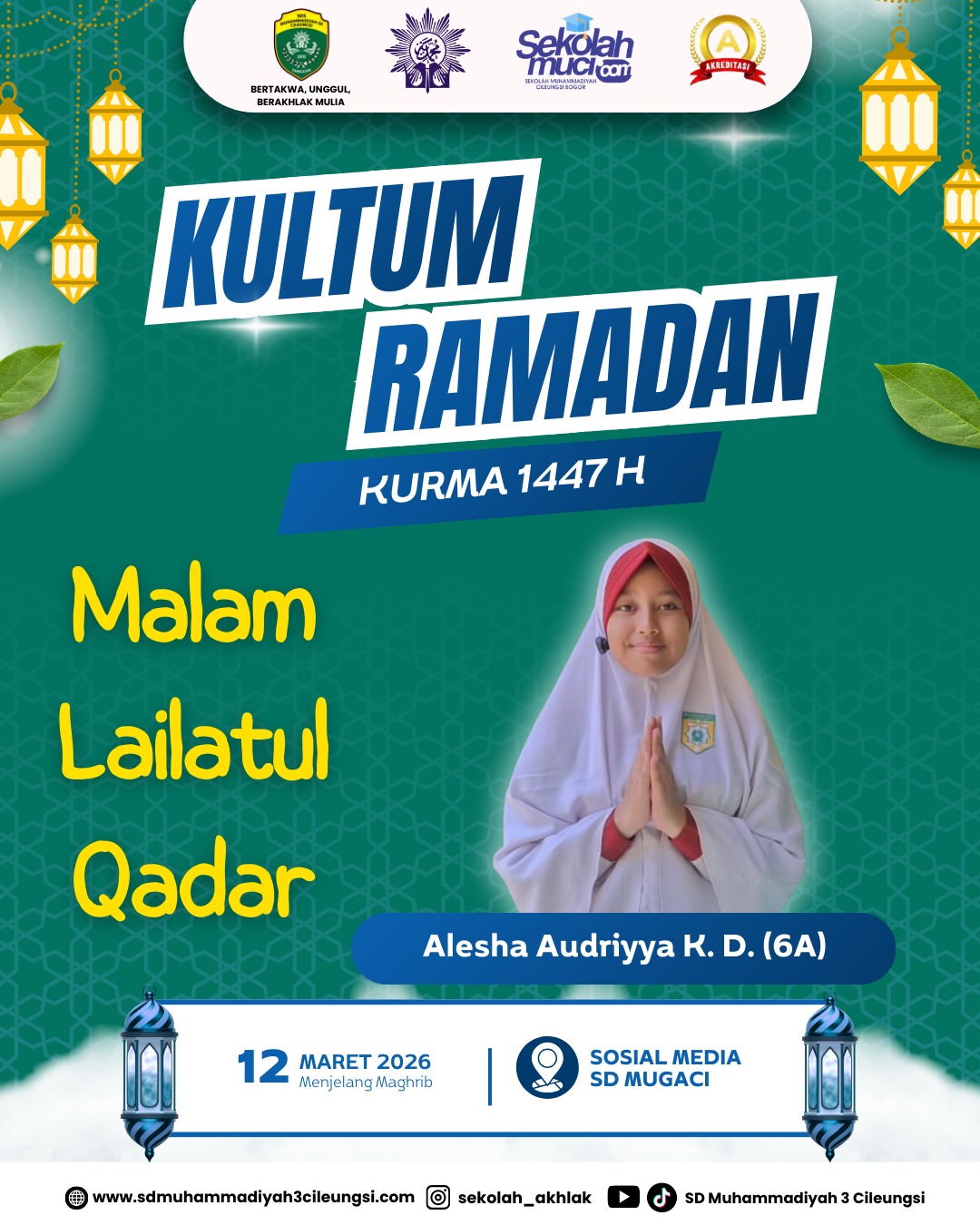 Kultum Ramadan (KURMA) 1447 H kembali hadir menjelang waktu berbuka puasa. Pada kesempatan kali ini, kultum disampaikan oleh Alesha Audriyya K. D., siswa kelas 6A SD Muhammadiyah 3 Cileungsi, dengan tema “Malam Lailatul Qadar.”